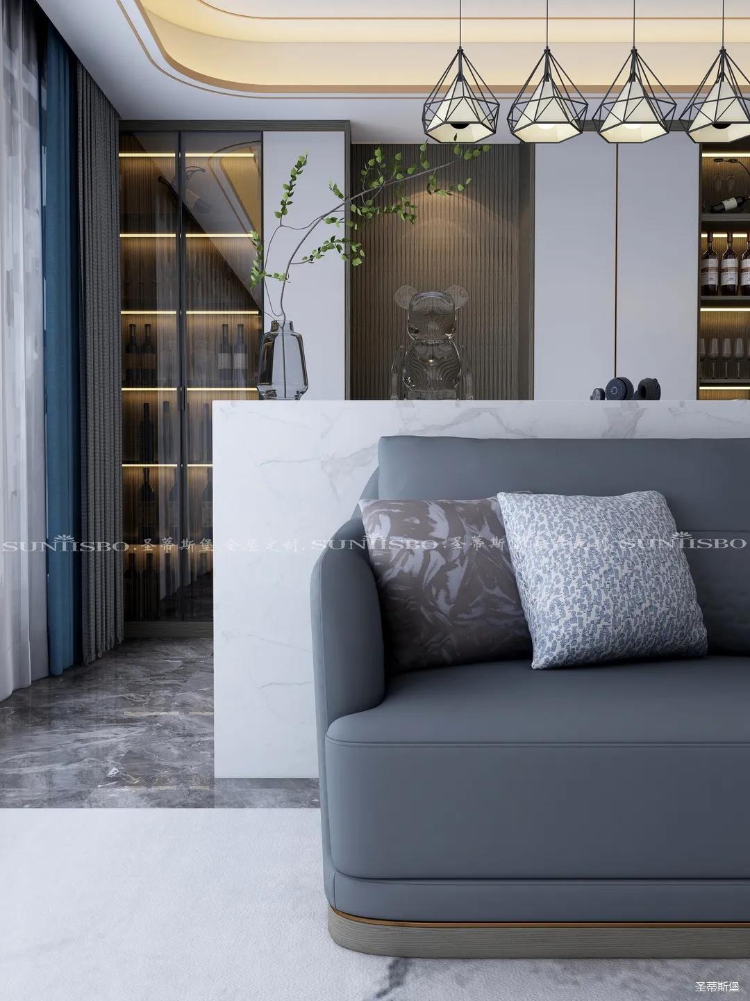 卧室的设计继续延续着空间的高级灰,蓝灰色彩的对比,让主卧空间层次感更加丰富,充足的阳光随意散落,空间更加温暖大气,对称的球形吊灯设计,恍如两个“快乐星球”,展现着空间应有的艺术性,设计师巧妙地设计,营造出与众不同的生活品质。